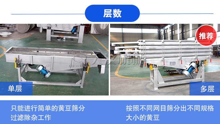 不同層數的不銹鋼直線篩篩分出來的效果也是不一樣的,單層只能進行簡單的黃豆篩分過濾除雜工作,而使用兩層及兩層以上篩網則可以按照不同網目篩分出不同規格大小的黃豆,所以在黃豆精選工作中,我們推薦您使用兩層以上的不銹鋼直線篩。